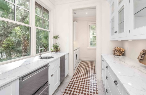 Ascend the grand brick staircase, and you will find yourself on a gracious front porch nestled among nature. Once inside the home, you will immediately notice the breathtaking river vistas that pour through floor-to-ceiling windows. Offering an open floor plan designed to highlight the water views, this home has a seamless flow ideal for gathering. In the living area, you will appreciate the coffered ceilings, comfortable white sofas, and wall-mounted picture frame TV. Fit for a chef, the open kitchen has a large island with bar stool seating, white cabinetry, high-end appliances, and a corner breakfast nook.