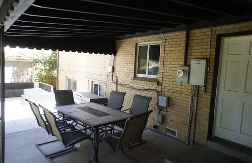 Big, fenced in backyard with patio, lounge chairs, outdoor table, sun umbrella and covered overhang.