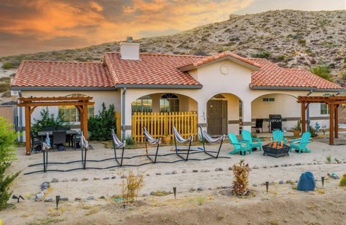 A dream Joshua Tree getaway awaits you in the artistic confines of this newly renovated 2200sqft hilltop retreat. Enjoy panoramic views of Yucca Valley while soaking in a 7-person hot tub, gaze at the starry night sky while laying in one of 6 comfortable hammocks, toast marshmallows by the fire pit, and enjoy a game of Bocce Ball at your private court! We also have a full-sized basketball hoop in the backyard, a cornhole set, and a fantastic board game collection. Be sure to bring your camera!!
