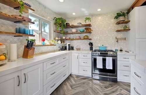 At this luxe private retreat, the backyard promises a spa experience unlike any other—saltwater spool, jacuzzi, firepit, peekaboo ocean views, and a lanai with its own bar and fireplace, too. Stretch out on the lounge chairs, watch the game from the pool, or drift inside the house to bright and boho California decor. Just 2.5 miles from the beach, it’s a perfect spot for family getaways, friend groups, or anyone craving resort-level ease without sacrificing proximity.