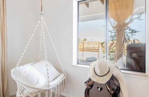 Experience the unique charm of Haven Ranch, nestled on 5 private acres between Indian Cove Canyon and 49 Palms Oasis Trail in Joshua Tree. This modern Bohemian chic retreat offers 4 bedrooms, a den, e-bikes, a luxurious spa room, and two fireplaces. Enjoy breathtaking sunset views from our custom fire-table seating 16, overlooking snow-capped mountains. Features include a hot tub, saltwater pool, exquisite decor in every room, and a fully equipped kitchen. Ideal for all ages, with children 5 and under not counted.