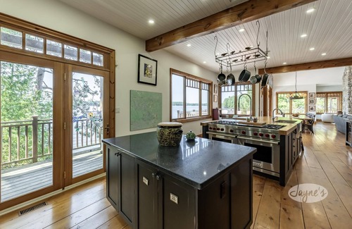This kitchen has 2 islands, stainless appliances, double-stove with 6 burner gas-range with additional (Wolf) and a walkout to the deck.