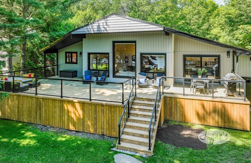 FAMILY TIES - As you drive up to this pretty property, you are greeted by a newly renovated home and recently landscaped grounds. Everything is NEW! New front porch with portico, new back deck with glass railings and new dock with boat port. The driveway has a basketball net for the kids. A large grass frontage and new front porch await. As you move around to the back, you are greeted by a new deck that runs the length of the cottage, with glass railings allowing for unobstructed views of the lake, outdoor dining area and lounging area with all new patio furniture. Step down to the level grassy yard with fire pit and outdoor stone fireplace. This magical space is lit up at night and is just steps to the water with shallow, sandy entry (great for the kids) and a new dock with a single slip boat port. This property was featured on Season 3 of HGTV Canada’s Scott’s Vacation House Rules!