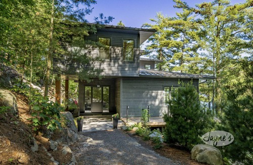 ROSSEAU PRECIOUS RETREAT - Brand new cottage in a private setting very close to the lake with extensive landscaping, multiple outdoor seating areas, granite walkways and few stairs to the new dock and the waterfront of Lake Rosseau's Morgan Bay. Landscaped firepit overlooking the lake, the deck with lounge furniture or the dock, there's the perfect spot for everyone.
