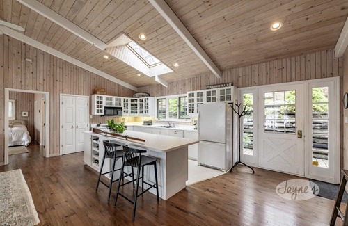 This well equipped, white and bright, open concept kitchen has a large island that seats up to 3 and looks onto the large dining space and cozy great room.
