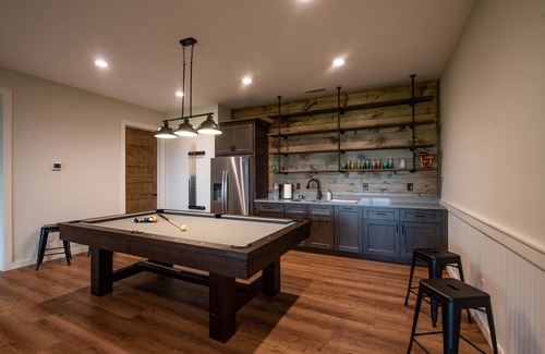 Downstairs in the game room you'll find a 65" HD Smart TV, gas fireplace, pool table, shuffle board table and large wet bar with full sized refrigerator and freezer. Both living areas open onto the decks. Whether you're enjoying a cup of coffee in the morning, an amazing sunrise or sunset, or relaxing in the hot tub under the stars, the stunning view provides the perfect backdrop for an unforgettable vacation.