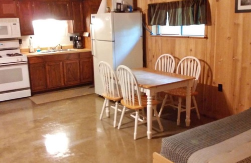 The cabin has central air conditioning, an electric central furnace heater, ceiling fans, wood burner, leather couch and recliner, porch swing, and a picnic table out back! It has beds to sleep 7 (please see below for a description of the bedding arrangement), has satellite TV in the living room, a full kitchen with range, refrigerator, and microwave. Outside, there is a propane grill on the front porch. There is also ample space for a nice campfire to roast hot dogs and make S'Mores! Jim-Bo's bar and grill is right next door within walking distance if you so desire!