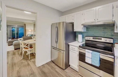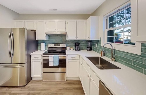 Completed renovated top to bottom, this 2-story townhome features open living space on the first floor and 2 large bedrooms with king beds on the 2nd floor. As you enter the home you will find the kitchen on your left, featuring beautiful white quartz countertops, stainless steel appliances and large french door fridge. The open living area feature a large comfy sectional couch, dining table, wet bar and half bath. Through the living room step into the spacious, light filled sunroom with quint sitting area perfect for enjoying coffee or a book. From the sunroom open the sliding glass door to step straight into the luxurious elevated outdoor shower. Off the sunroom is the lush back patio area with covered picnic table and bistro lights for the evenings. There is a separate laundry room off the sunroom that house full size washer and dryer as well as beach gear and extra storage. Upstairs you will find 2 large beautifully designed bedrooms both with king bed. Positioned between the bedrooms is the full bath with tiled shower, large waterfall shower head, handheld sprayer, and granite corner bench. The 3rd bed is a folding queen size memory foam mattress with collapsable bed platform which is easy to setup and can positioned wherever is convenient. The bed is stored in the laundry room and is quite comfortable, much more so than your traditional pullout or air mattress. For guest convenience we provide coffee, sugar, bath and beach towels, bed linens, paper towels, toilet paper, and soaps.
