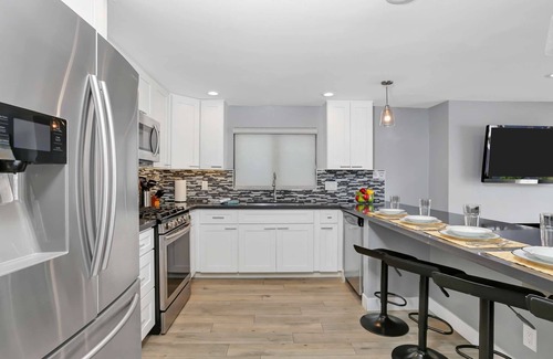 The living room and outdoor patio are separated from moving glass doors that can be hidden inside of the wall to create a wide-open space that the entire family can use to enjoy the cool ocean breezes. The living room has a large flatscreen TV so you can keep up with the game or the news. Just a few steps from the main living area, the kitchen serves as a central meeting point - which is fully stocked with cooking/dining gear and top of the line appliances. You can choose to cook your meal on the outdoor grill or in the gourmet kitchen! The main countertop serves as both prep and dining space. You'll be sure to enjoy the kitchen if you decide to eat in and make a great meal during your vacation.