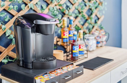 The living room/dining room/coffee bar/kitchen are located on the second floor.