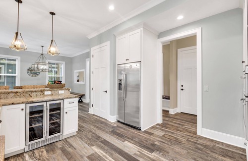 This spacious kitchen features stainless steel appliances, a gas stovetop, elegant copper farmhouse sink, granite countertop space, and a beverage fridge! The island provides seating for 2 and the dining room table seats 8 making plenty of space for everyone.