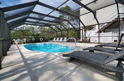 If you're looking for a private island retreat this beautifully decorated 5 bedroom 5 bath house each with its own on suite is it. With easy beach access via boardwalk with no street to cross in the Plantation, private screened in heated (for a fee) pool and natural quiet surroundings this house is sure to please. Relax by the screened in private pool with plenty of space for sunbathing. If shade is what you prefer the house has a screened in deck area with table for eating and covered deck space with seating.