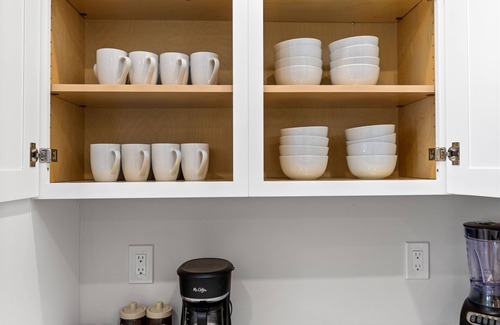 - Fully equipped kitchen with pots/pans, kitchen knives, basic condiments, bakeware, dinnerware, coffee mugs, cooking utensils, measuring cups, coffee machine, toaster, kettle, microwave, coffee, tea, and more!