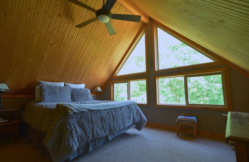 In the Foothills of NC, this unique home has three bedrooms, (one on each floor) two full baths and a cozy loft with a queen sofa bed. This is a very comfortable and well equipped home. It is surrounded by fifty acres of quiet, private land, covered with mature forests; the setting will give you the privacy and quiet you crave. The driveway up to the home is one half mile and privately maintained. There is pavement at the beginning and gravel all the way to the top. The house is at the end of the road on the right at the top. The driveway is steep, but most cars and SUV's have no issue. In really bad weather you might you may have to give it a little more gas. This is the price we pay for a prized location!