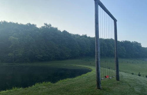 Depending on the season, you may find goats and sheep grazing in the pastures on this quintessential Amish property. And as we harvest the hayfield by horse drawn equipment, at certain times of year you may find the fields in view of the house being cut and put into hay bales. Guests are encouraged to spend time exploring the grounds, strolling around the pond, swinging on the hand-built Amish long-swing and swimming, fishing, boating or simply relaxing at the pond. At the house are generous spaces where one can relax in peace or congregate in groups, such as the front covered porch, the great room common area, or on the back patio.