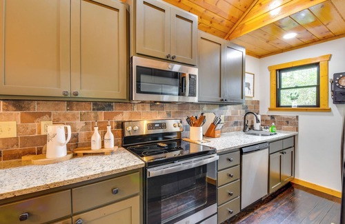 The North Georgia mountains are calling! Situated on 40 acres outside Helen, this vacation rental makes it easy to enjoy the simple pleasures of country living. Boasting a modern-rustic flair, this 2-bedroom, 2.5-bath cabin features a spacious deck and direct trail access. Start your days with farm-fresh eggs, then fish in nearby rivers, explore Helen's alpine village, or take the family to Brasstown Bald!