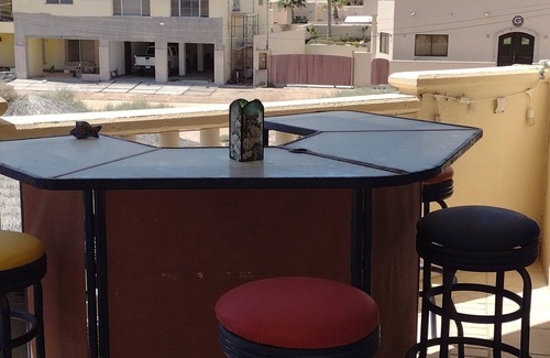 Tired of boring colors in your rentals? Enjoy the brilliant colors of Mexico in this traditional Pancho Villa Rental Home across from the beach! This spacious villa sleeps total of 6 people. Start with the stunning Garden Fountain entrance. Walk up the rod iron stairs under a bodega cupola past a bright loft Bedroom at the top of the stairs with Murphy Queen bed, sleeps 2, and pull-down shades. One bedroom with Queen bed and TV, and a Sofa pull out Queen bed in the living room.