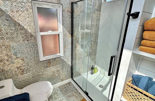 -Full Size Bathroom with Shower & Oversized Vanity Sink, Halo- fog free touch mirror, space for luggage