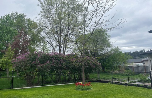 The property is surrounded by lilacs which bloom from May to June. A spectacular setting for a wedding or gathering with the multicoloured blooms and the incredible scent. There is outdoor furniture to enjoy the yard. As the huge trees in the back fill out in late spring, they provide a beautiful canopy to provide ambiance and shade. This area is perfect for a ceremony and reception. We can accommodate up to 80 people for an event comfortably and are happy to discuss events for 2026 and 2027.