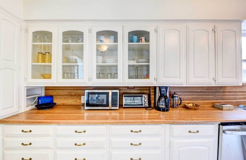 KITCHEN: Dishwasher, refrigerator, stove/oven, microwave, coffee maker, French press, toaster oven, dishware + flatware, cooking basics, trash bags + paper towels, complimentary spices