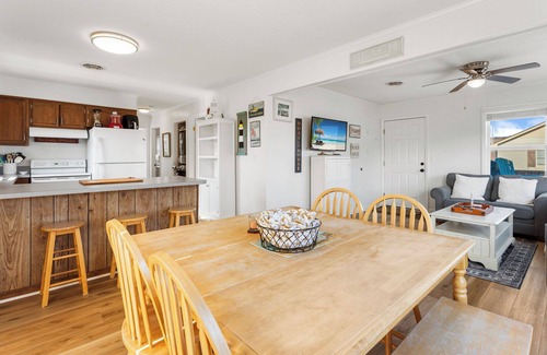 Inside, The Happy Crab is thoughtfully designed for comfort and convenience. The main level features a Queen Master Bedroom for ultimate relaxation, a second Queen Bedroom, and a cozy Bedroom with two Twin Beds—perfect for families. The cook's Kitchen is equipped with modern appliances for all your culinary creations, while the inviting open-concept Living Area and Dining Area provide a welcoming space to gather and create lasting memories while you soak in the Outer Banks sunshine. Step out onto the deck to enjoy beautiful views and an evening under the stars. Back inside, a hallway bathroom adds to the convenience, ensuring everyone feels right at home.