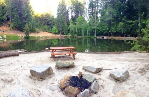 COMPLETELY private 9 acre property with gated driveway surrounded by huge 100'+ tall Cedar, Fir, Madrone and other native trees, a beautiful spring-fed 1 acre lake with large dock and a year-round creek with numerous access trails to El Dorado National Forest. There is a walking path around entire lake that include two log bridges. Two stand-up paddle boards and a paddle boat add to the fun! Brand new three hole frisbee golf course. There is a granite fire pit just outside the kitchen door and a second granite fire pit on the water's edge of our beautiful sandy beach. There are also several picnic tables with umbrellas around the property, a gas BBQ, large patio with grass play area, horseshoe pit, basketball hoop and more!