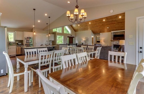 The main Floor Features Stone Fireplace, Wood Flooring, Vaulted Ceilings, Granite Counter Tops, 2 Dishwashers, Double Wall Oven and 2 Large Stainless Refrigerators. for Dining, you'll have 3, 8 Seat Dining Tables and a Large Island/bar That Seats 7. The Large Covered Deck Overlooking the Lake Has 2 Large Dining Tables, Chairs, and two Gas Grills. Two bedrooms on this floor each with king beds ensure anyone with constraints on stair usage can still join in the fun.