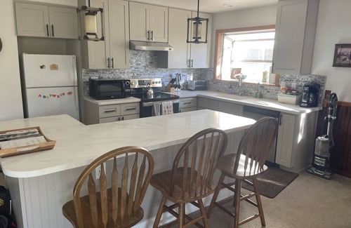 This extremely spacious 1900 Square feet home features 3 bedrooms and 2 full bathrooms (each with a shower and bath tub). The master bedroom and bath take up the entire second floor, with a giant window that faces the lake. The other two private bedrooms are on the first floor along with an additional bathroom. There is a large playroom that is perfect for children, and features a futon for added sleeping capacity. The large open combination living room, dining room, and kitchen feature a wood burning stove that lends cozy heat and ambiance. Newly remodeled kitchen as of November 2023. You'll also love the spacious deck equipped with a propane grill for easy cooking, and nestled among a row of pine and oak trees.