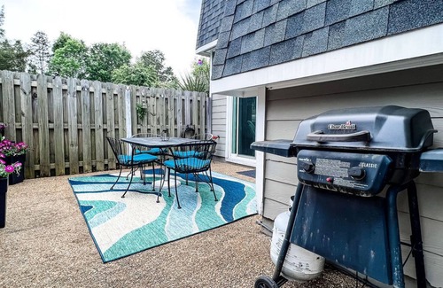 Sleeps 9 using the queen- sized pullout sofa in living room. Fenced in patio area to hangout or grill. Gas grill ready to BBQ Burgers or fresh Carolina Shrimp. Kitchen has everything needed for cooking and serving dinner at home. Washer & dryer located on the 1st floor and two beach cruiser bikes for your use. Comes with two parking spaces. Front door has electronic deadbolt with a code for easy access.