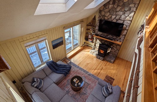 This comfortable, spacious 4 level condo sleeps 8 and features a fantastic open floor plan. Gathering the group for games, dinner or just hanging out will be a highlight of your stay. Just a mile from the restaurants and shops of North Conway Village, you can easily walk to Cranmore Mountain as well as the trails of Whitaker Woods. In addition, you can now pick up the newly paved North Conway Rec Trail at Cranmore where you can even rent bikes! Our location is phenomenal as a home-base for your adventures: it's quiet and wooded, yet so close to the hiking, biking, skiing, riding, paddling, climbing, dining, and outlet-shopping you come to North Conway for! Relax on the deck or keep your workout streaks alive in our gym, complete with Peloton bike, Bowflex SelectTech weights, yoga mats/blocks and a 5-person Finlandia Sauna. Amenities include brand new air conditioning, a 65" smart TV with surround sound; WIFI; deck for lounging and stargazing; a large, fully-equipped kitchen; plus a cozy sleeping loft, accessible by ladder for the adventurous.