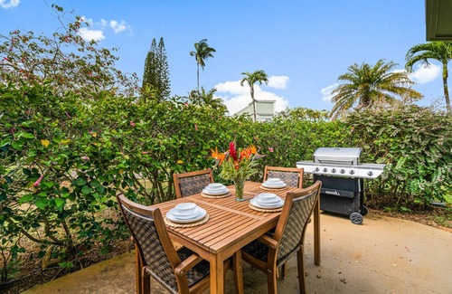 Relax & recharge in this calm, stylish space. The A/C or tropical breezes await you after a day of island adventure. Nestled near the ocean bluff along the Makai Golf Course. The kitchen is fully equipped. New furniture throughout. Private gas BBQ. Private washer/dryer. Near community pool. Near Sealodge Beach Trail & Queens Bath. An ideal residence for Special Occasions & Life Celebrations. Centrally located to shopping, amazing beaches, restaurants, Hanalei & Kilauea Town.