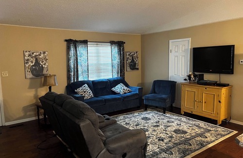 Do you feel like taking a boat ride? Riding miles of brand new bicycle trails? Hiking numerous trails? Seeing waterfalls? Golf? Family friendly swimming? Antique shops? Bowling? Skating? Award winning restaurants? Or maybe just hanging around the house and sleeping late in your own quiet neighborhood across from the water while enjoying the warmth from the fireplace? These things and more can all be yours at this outstanding location, centrally located less than 5 min from any of the attractions listed. This home has room to sleep 6-7. Cable TV and high speed WiFi are just a couple of the standard amenities, as well as an enclosed garage to protect your vehicle from the rare storm. Laundry won’t be a problem with a washer/dryer on premises. Hate to do dishes…let the dishwasher do them for you. Feel like cooking your own meals…easy to do in a large kitchen with an equally large island with breakfast bar. The patio area is set up for entertaining or relaxing with plenty of comfy padded chairs and a BBQ grill. This is all located in a very quiet and SAFE neighborhood. So come to the lake and relax, eat, shop, and have a great time whether it’s a couple or a family. We look forward to you being our guest!