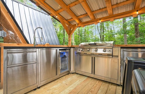 Step outside to a fully-equipped outdoor kitchen, perfect for culinary enthusiasts. Grill your favorite steak, chill beverages in the mini-fridge, and rinse fresh produce at the sink, all while enjoying the calming whisper of the surrounding trees.