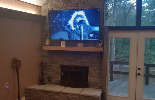 This A frame is 3 stories, and is surrounded by 30 acres of woods. 4 TV's, cable, internet,pool table, air hockey table, and bar in the basement. Has 4 outside decks,a fire pit,lots of firewood, and outdoor seating. Lot's of deer, owls, and turkey's running all around the property.