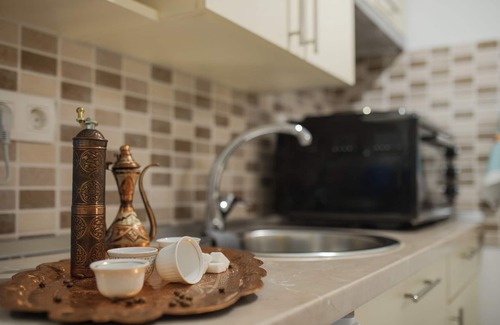 The house and this condo is located in a quiet part of town, just a short walk from the Old Bridge. This part of the city is also known for its art, because of the theater, the poets Aleksa Šantić, and the Museum of Herzegovina. It consists of three separate floors and each has its own separate entrance. Each apartment has a separate kitchen, dining area, toilet and shower, cable TV, WI-FI, fire sensors and panic light for power outages. Apartment Sky is located in the attic of the house overlooking the city of Mostar. It is furnished rustically and is dominated by the colors blue and brown. The apartment has an original iron heating stove from the 19th century with a motif of the Bosnian king.