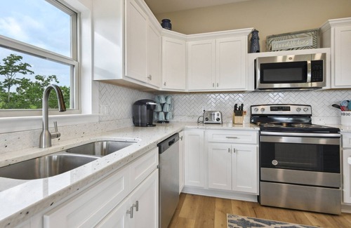 Stepping into the home, you will find an open kitchen/dining/living room concept that is meticulously decorated with every mindfulness to detail. The kitchen is fully stocked with everything you need, with stainless steel appliances, a Keurig, toaster, granite countertops, bar seating, and a large dining table. A highchair for the little one is provided on the property. No need to pack yours.