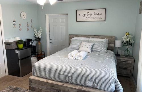 BRAND NEW RENOVATED private and romantic guest room with private entrance and small patio. The room is very comfortable, queen bed size, it has its own private bathroom. Everything in the room is brand new. We provide Wi-Fi, work desk & office chair, TV, Netflix, refrigerator/freezer, microwave, coffee maker with coffee and cream, and variable speed ceiling fan.