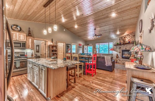 A rare 'Spotted Owl' sits among the pine trees patiently awaiting your arrival! This rustic, 1,547 sq. ft. one level, beautiful 3 bedroom/ 2 bath home gives you that true "cabin in the mountains" feel while still being modern, cozy and unique inside! The wonderful 'Spotted Owl' has recently been remodeled and includes gorgeous finishing touches that you'll have to see to believe; from granite countertops and stainless steel appliances in the kitchen, to a gas fireplace you control with a switch on the wall! It even has LED lighting in the living room for some added ambiance in the evenings! While being close to shopping and dining, Spotted Owl is a one level home located in an area of Ruidoso that boasts a secluded and peaceful feeling at the same time. This lovely home has an amazing gated and fenced in front deck for you to enjoy the sights and sounds of the forest while enjoying your morning coffee or evening glass of wine, as well as a private, gated and fenced in backyard for your dog friends (and/or children) to run around in while you grill up some food or relax and unwind in the brand new 5 person hot tub. Included is parking on the side of the home and once entering the back gate, there are virtually no stairs to have to climb to the backdoor! Peaceful and serene, this is the perfect getaway to retreat to and simply not 'give a hoot'! Spotted Owl has central air-conditioning and heat, gas fireplace, and a brand new RO water filtration system (as of 2021). 4 wheel drive and/or chains are highly recommended in the winter months. **Home is equipped with driveway and/or ring doorbell cameras for the safety of our guests and the home. These cameras are only located facing outward toward the driveway or front entrance. Cameras are not allowed inside of a property, facing in the direction of the property, or in a common areas such as near a hot tub.