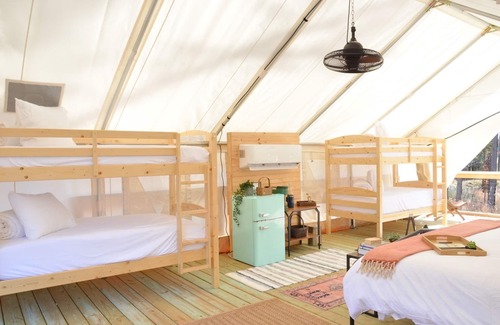 Inside the tent, you'll find a cozy king bed adorned with soft white linens, in addition to two bunk beds that promise a restful night's sleep. We've taken care of the essentials, including a mini refrigerator, a Keurig coffee maker, and electrical outlets for your devices. Take up cooking by fire at the fire ring with a cooking grate, dine at the picnic table, or unwind in the hammocks.