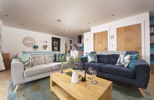 This ground-floor property offers beautifully furnished open-plan living. In the sitting area, you'll find two comfortable sofas, a wall-mounted television, a DVD player, and an Apple AirPort Express integrated hi-fi system. The space is further enhanced by a contemporary wood-burning stove, creating a cosy ambience on cooler evenings. The dining area features a dining table and comfortable seating for up to four guests. The well-equipped kitchen boasts a double electric oven and hob, fridge/freezer, dishwasher, washing machine, and coffee machine. It also features a modern kitchen island and a breakfast bar with additional seating for two. The open-plan living area seamlessly extends outdoors through bi-fold doors, allowing the refreshing Cornish breeze to flood the space. Bedroom two offers twin single beds, while bedroom one boasts a king-size bed and comes complete with an en-suite shower room. An additional family bathroom features a bath, overhead shower, wash basin, and WC for added convenience.