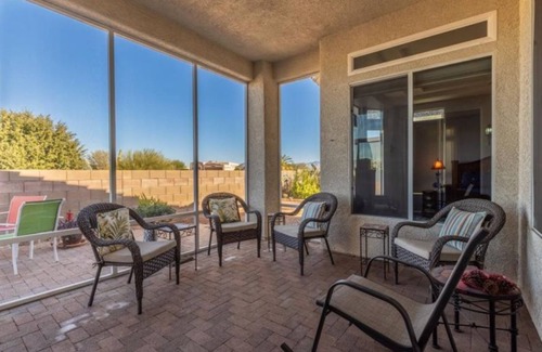 Welcome to our warm and light-filled home with all of the amenities. This home features an open floor plan, great for entertaining or just relaxing in this peaceful environment. The master suite is large and comfortable with its king bed, walk in closet and large bathroom. The second bedroom is also very comfortable, with a bath across the hall. The kitchen is well equipped and there is a small office down the hall. This home has a screened in porch, and outside sitting areas for morning and afternoon light. It is a perfect get away from the winter weather. Close to walking trails, golf, the property is part of the GV Recreation program which allows for access to pools, gyms, pickle ball, tennis, pottery studio, metalsmith, woodworking, concerts and many other classes. This home is in a gated community and has a view of the Santa Rita Mountains from the back patio where you can watch the mountains turn pink every afternoon.