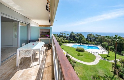 Venez profiter d’un bel studio de 42m² très agréable en hauteur, avec une magnifique vue mer sur la pointe du Cap d'Antibes et des iles de Lérins depuis sa 16m² grande terrasse!