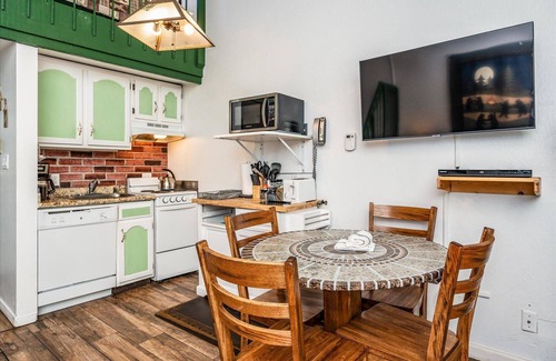 On the main level, you have a living room, with a fully equipped kitchenette, that has a stove/oven, refrigerator, microwave, coffee maker, toaster, dishware, cookware, and silverware provided. Our loft units also offer DVD player, with a free videotape library, river rock propane fireplaces, and private outdoor decks with electric barbeques. Sleeps 4-6. Please be advised sofa beds are only acceptable for small children, not for adults, as they are uncomfortable for adults, so we will not guarantee a good nights rest on them.
