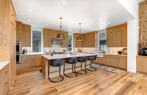 Step inside to discover interiors that are both inviting and sophisticated, with an abundance of natural light that enhances the warm ambiance throughout. The open-concept living room, anchored by a large gas fireplace, provides a cozy setting for relaxation and connection. With ample seating, it's the ideal spot to unwind after an adventurous day, whether you're sharing stories or enjoying a movie night. The space flows seamlessly into a chef-grade kitchen, where culinary dreams come to life. This kitchen is not only perfect for whipping up meals but also offers enough room for a private chef to create a memorable dining experience for your group.