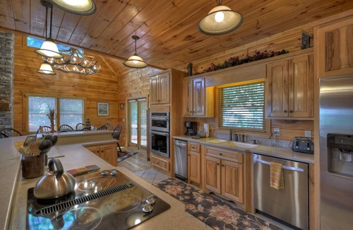 Above Raven Ridge is cozy with elegant features…the great room boasts a floor to ceiling stacked stone fireplace with electric insert (Inoperable at this time) so cuddle up and watch your favorite show or DVD on a 36” flat-panel TV. If you're looking for quality time, Above Raven Ridge has ample space to spread out your family or keep them all together at the dining room table set for 10!