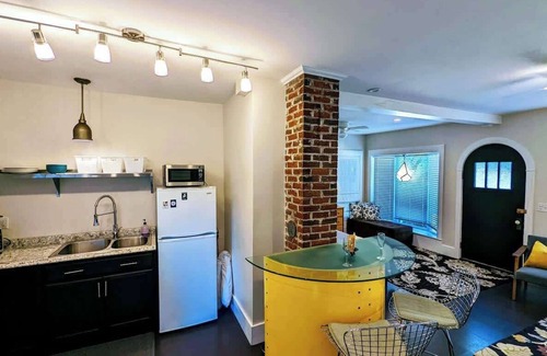 This first floor apartment has a queen sized bed, and lots of space and natural light. The gorgeous bathroom with a walk in shower is off of the bedroom side of the suite. The kitchen is stocked with pots, pans and dishes for those meals at home. The cool bar type table seperates the space between the kitchen and bedroom. There is a smart TV, internet, and a portable AC for those warmer days. You will love being so close to hiking, restaurants and the quaint village of Southwest Harbor.