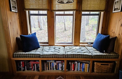 This lovely custom cottage is light-filled and beautifully appointed with a cozy first floor open living/dining/kitchen combination and vaulted ceiling. The comfy window seat is a great place to kick back and sip your morning coffee and watch a visiting family of deer in the woods. On chilly nights the small gas heater will add to the cozy comfort. Just off this space is the bathroom with a shower, with on-demand unlimited hot water. A spiral staircase leads to the open loft queen bedroom overlooking the living space and its window seat and wall of windows. Out the back door of the cottage is a deck with bistro set and a gas grill, a view of the woods and Eddie Brook.