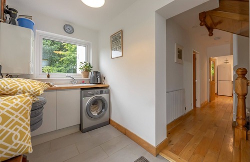 Sleeping four guests in two bedrooms, the cottage is decorated in a contemporary style and has been well thought out with three bathrooms and a boot room, as well as separate living and dining rooms. On the ground floor enter into the cosy kitchen, well equipped with a large butchers block, cooker and hob, microwave, Dualit toaster and full sized fridge-freezer. The kitchen opens into a dual aspect living room with views over the garden. This stylish room has an L shaped sofa and wingback armchair, along with a newly installed log burner, perfect for chilly summer evenings or autumn/winter breaks.