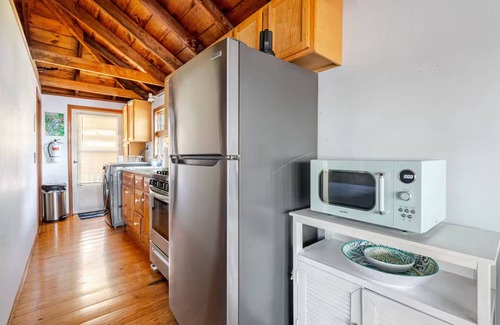 The space has a separate queen size bedroom with a closet, A/C and floor lamp. The living area offers futon that can sleep 2, coffee table, side table with a lamp, and an expandable small dining table that can also be used as a desk. The kitchen is equipped with full size stove and refrigerator, as well as washer/dryer.