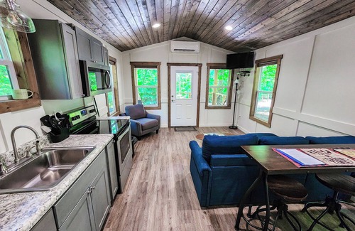 Cozy and quiet, this tiny house cabin will prove to be your new favorite getaway! This cabin proves to be the perfect outdoor retreat you are looking for with all the amenities you need. Our modern tiny house cabins are the perfect place to relax, though adventure can be found just around the corner. Our 670+ acre property sits right on Lake Guntersville. Guests can access the waterfront by use of our private roads. The cabins are tucked into the woods, not directly situated on the water. Boat parking with battery hook-ups are available. All cabins have full size kitchens, stocked with basic cookware. We ask that you wash and replace any items used during your stay. The cabins are supplied with bedding and bath linens to accommodate four. If you would prefer not to reuse bath linens, you can pack your own or request more at an additional fee. All rates include 4 guests and 2 vehicles.